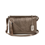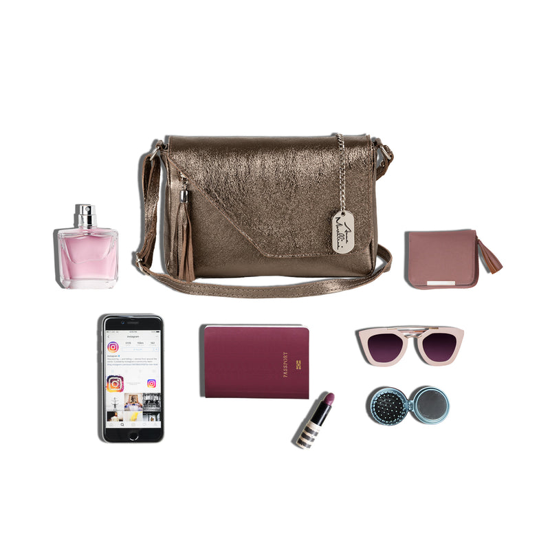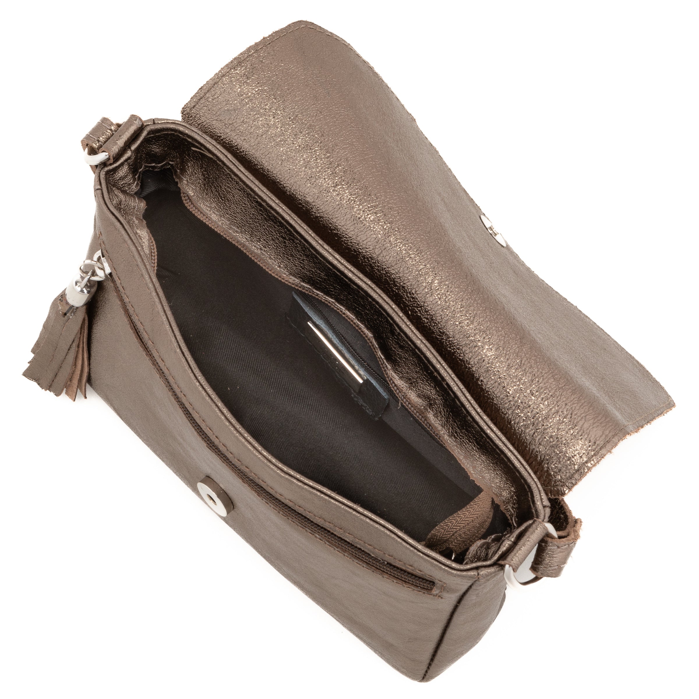 - Interior: internal zipper, metal pendents